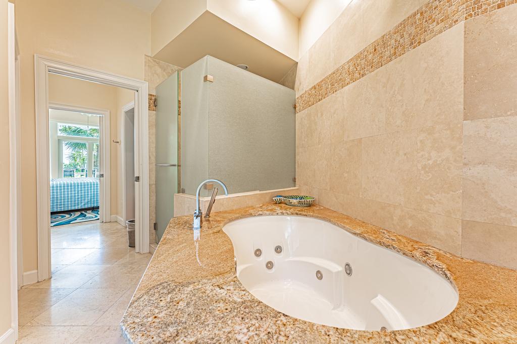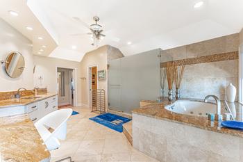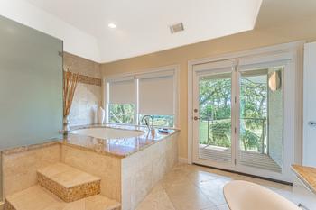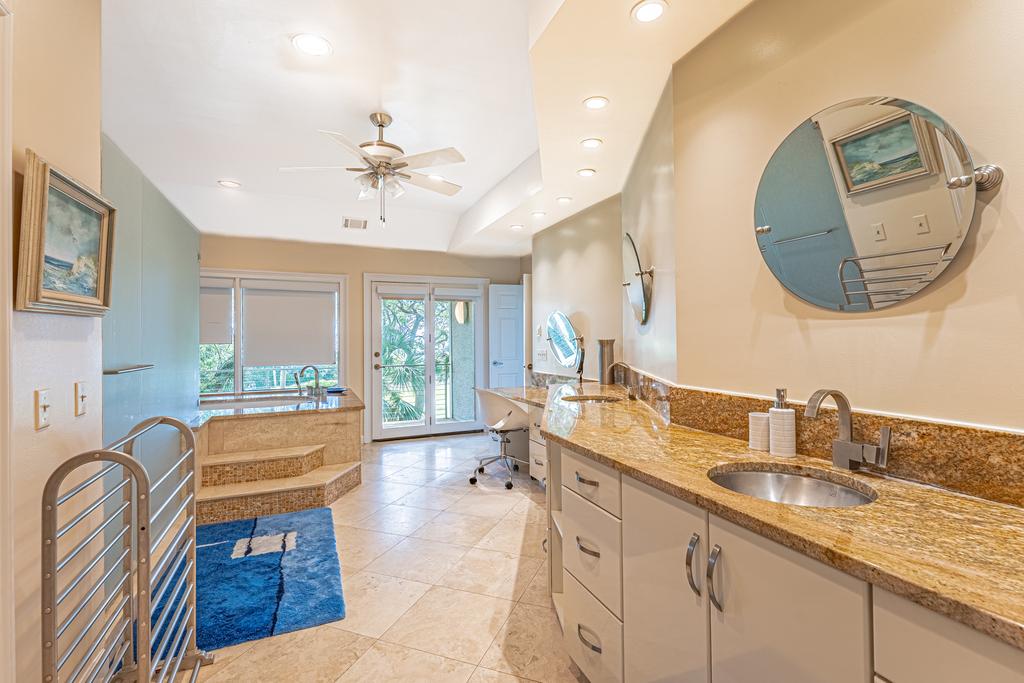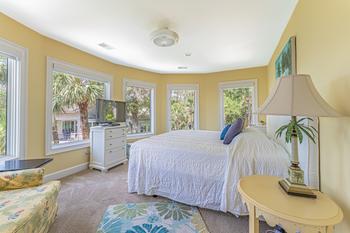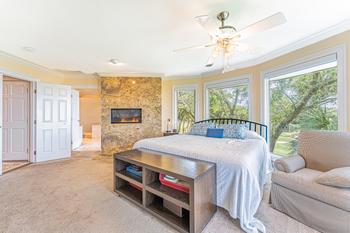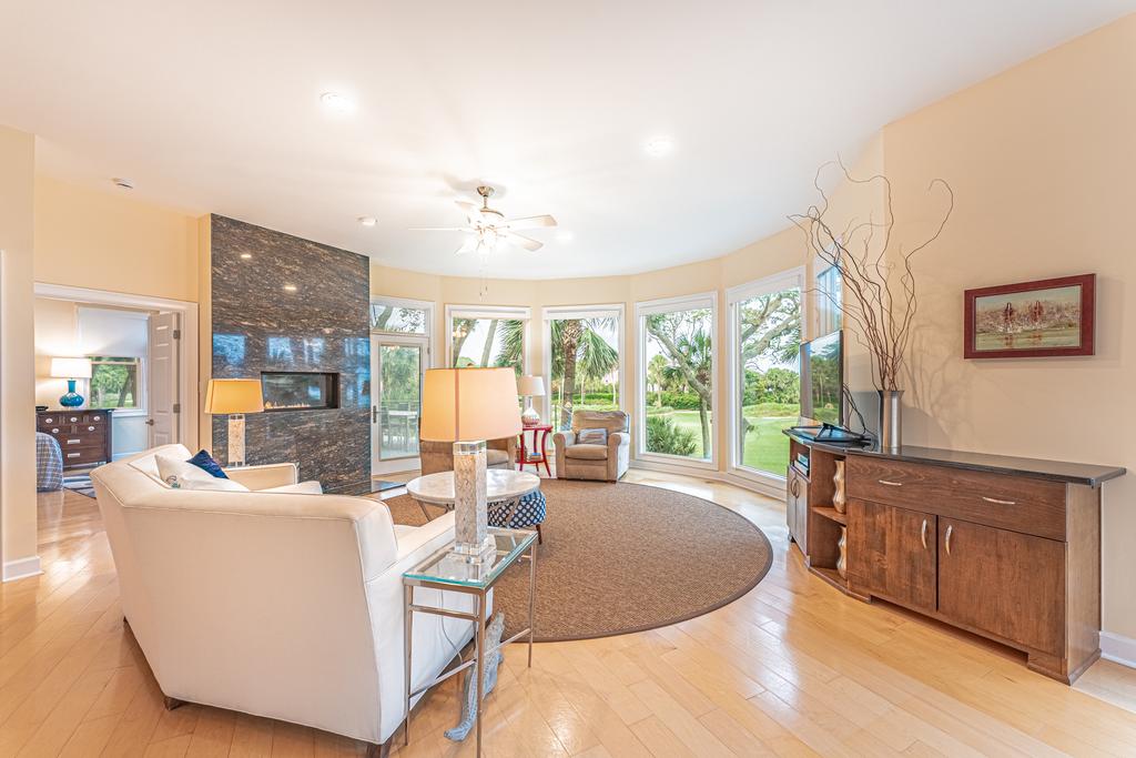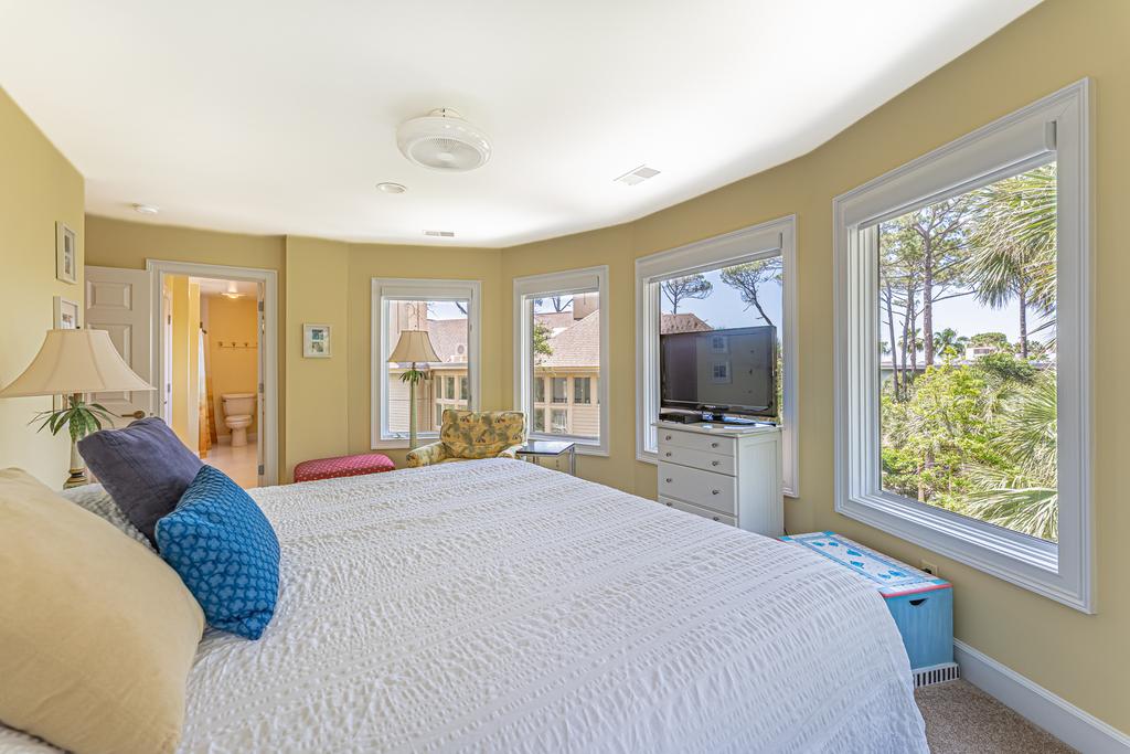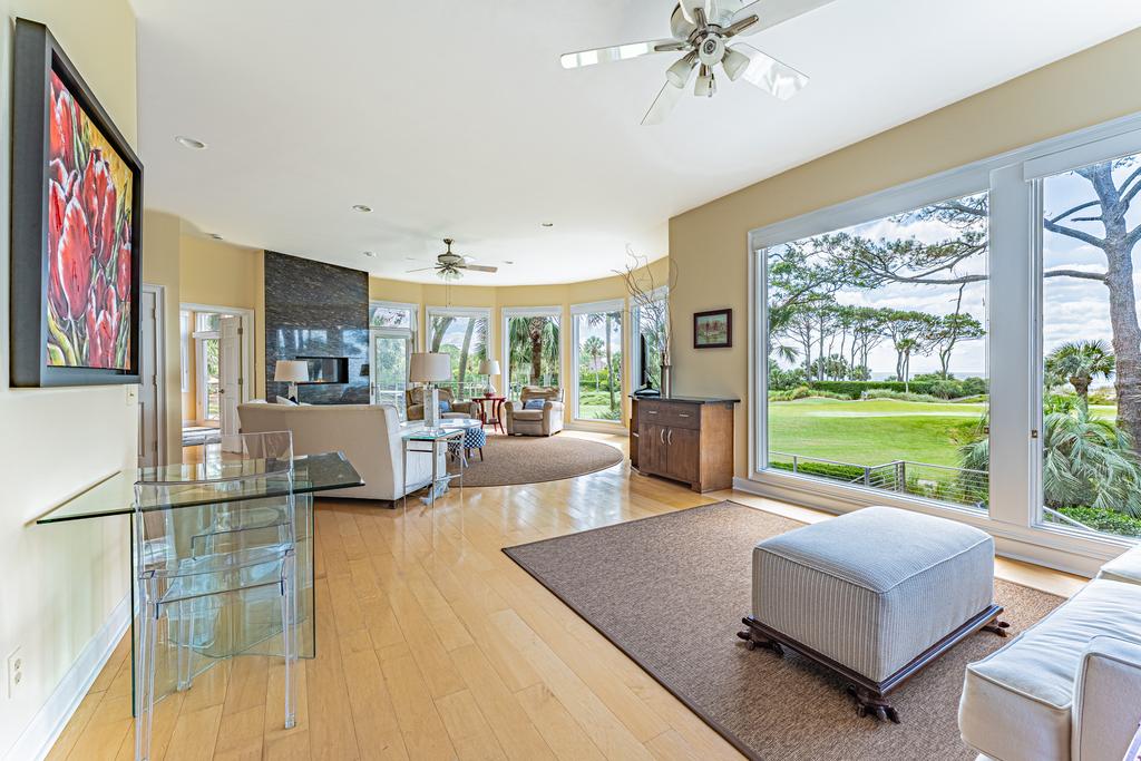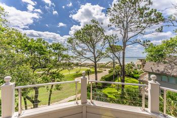 From the main entrance, you go up the beautiful winding stair case to the Master suite and three additional bedrooms and baths. The Master suite has a king size bed and fireplace with a perfect view of the green and the ocean to enjoy every evening. The oversize en suite master bath will include a large walk in glass shower and soaking tub. There is a walk in close off the bath and a outside deck to enjoy the view.