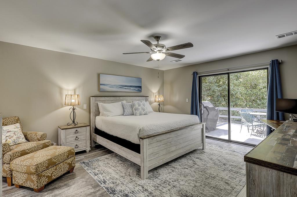 Primary Suite (Main Floor): King bed, en suite bath, premium linens, standing desk, monitor, ceiling fan