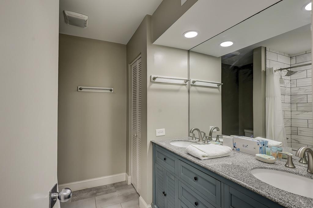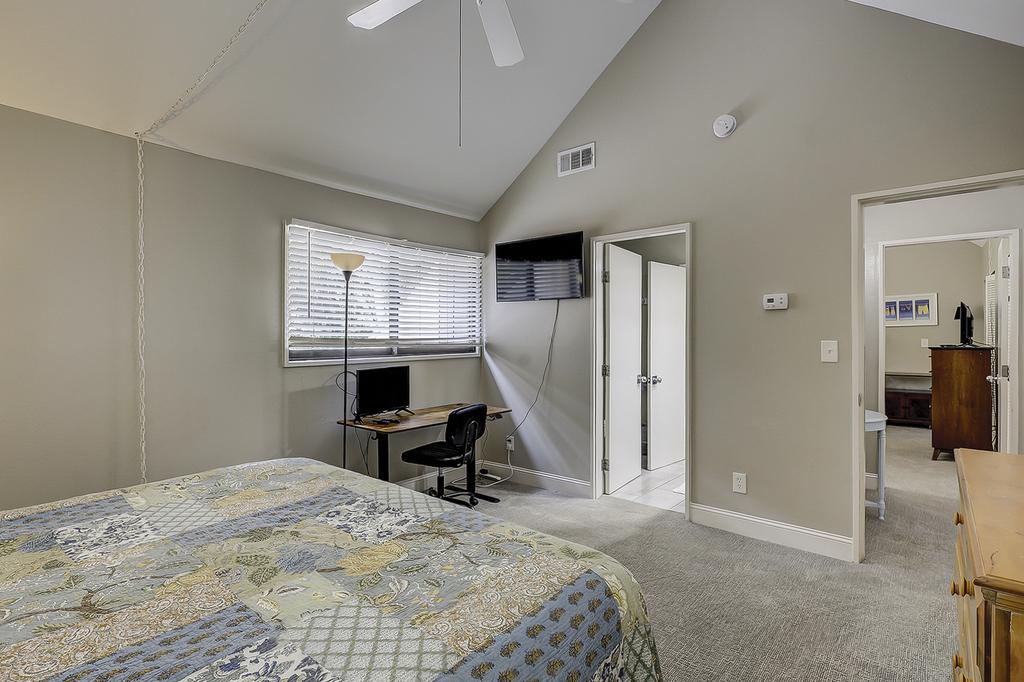 Guest Bedroom 1 (Upstairs): King bed, shared bath, desk, monitor, ceiling fan