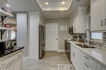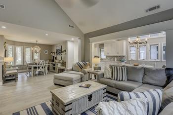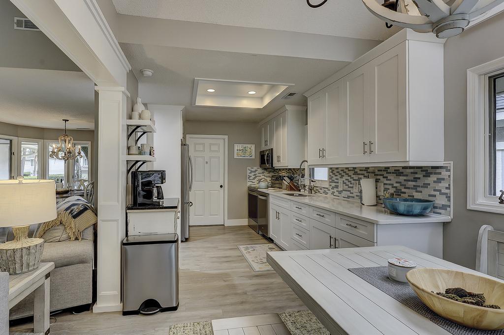 Updated kitchen is fully stocked with cooking utensils and small appliances to prepare the meals for the family vacation. Updated with hard surface counters, upgraded stainless steel appliances, open kitchen looking out to the living room, wonderful hard wood floors, high ceilings in the living room, large master suite with high end en suite bathroom and good size guest rooms for the family to enjoy. Wonderful amenities right behind the house, the swimming pool and tennis courts are a very short walk. Free tennis and very nice size pool.
